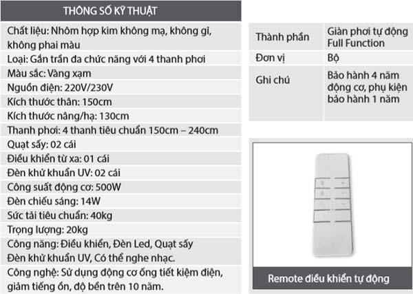 • Loại: Gắn trần đa chức năng với 4 thanh phơi